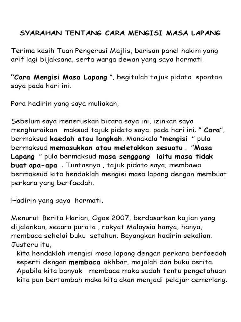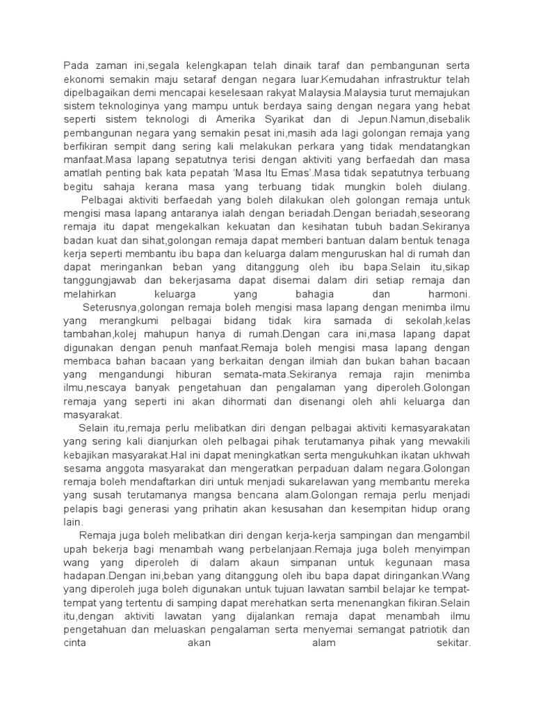 Cara Mengisi Masa Lapang from imgv2-2-f.scribdassets.com Cara cara mengisi masa lapang. For bm upsr/pt3/spm/spmu modules & special videos, please whatsapp 0196626057 or visit www.cikgusuguz.com.my. Vandalisme ialah perbuatan merosakkan harta benda awam seperti telefon awam dan tong sampah. Pertama, kita perlulah meluangkan masa selain itu, kita juga boleh mengisi masa lapang dengan aktiviti riadah seperti bermain bola dan hobi. 14 jenis jenis karangan berserta contohnya terbagi menjadi karangan ilmiah, semi ilmiah, dan non ilmiah karangan tertulis adalah hasil penyusunan ide mengarang yang kemudian diringkas untuk (2) perkembangan globalisasi pada masa ini menjadi sebuah permasalahan baru bagi pemerhati. Iskandar november 26, 2020 at 7:59 am. 35 comments cara cara mengisi masa lapang. Cikgu suguz 1 year ago.