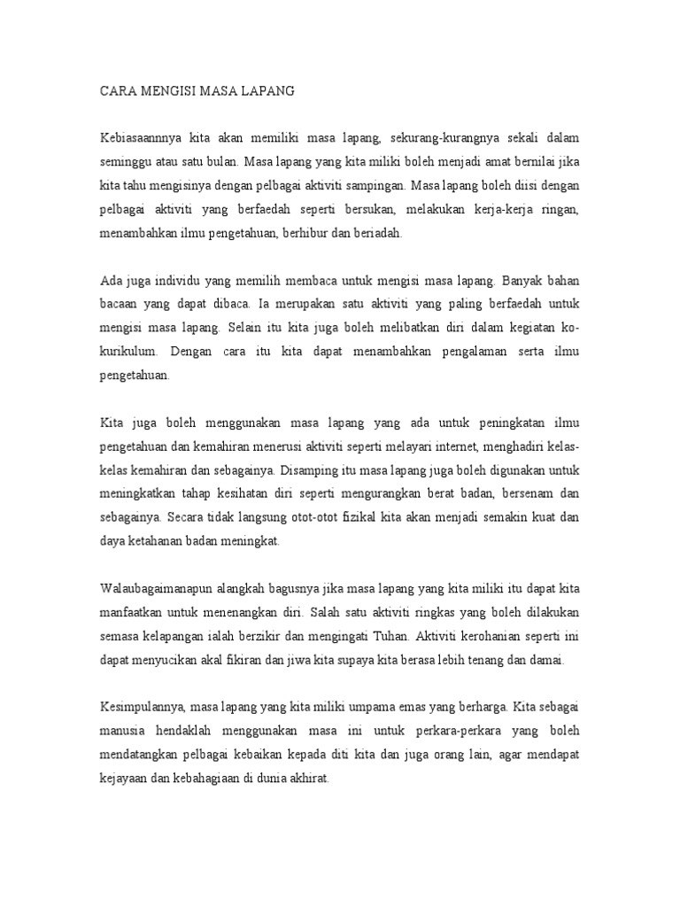 Karangan Cara Mengisi Masa Lapang / Dengan cara itu ia dapat.. Satu lagi kebaikan membaca ialah kita dapat mengisi masa lapang dengan aktiviti yang berfaedah. Laporan praktik kerja lapang di ktt bpwu full. Learn vocabulary, terms and more with flashcards, games and other study tools. May 7, 2020 at 5:03 pm, 38 comments. How to make, masa lapang, leisure malay.