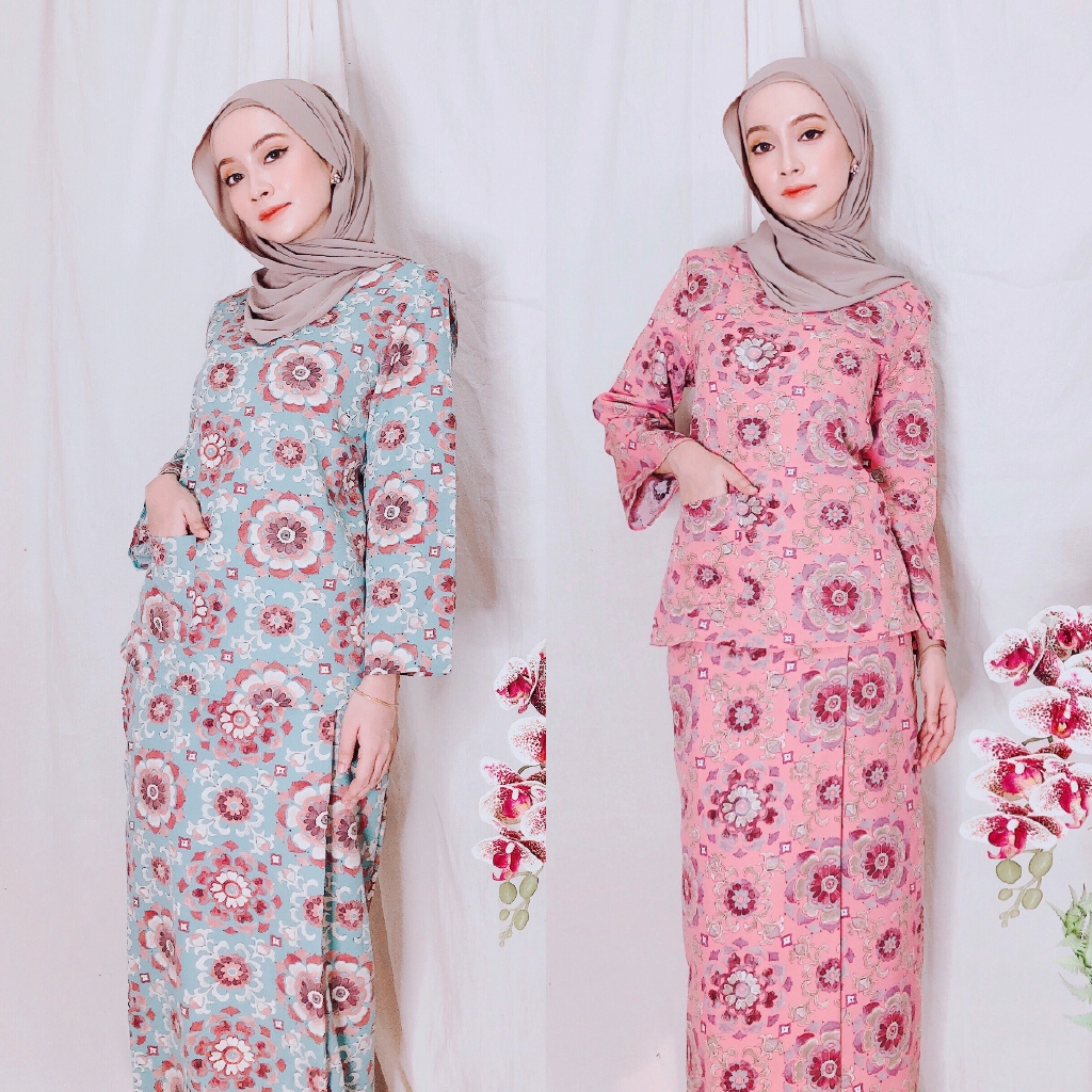 Kurunglab signature kurung kedah custom prints round neckline no zipper material :